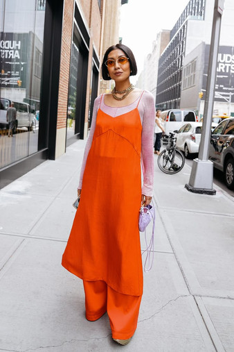 Volumes amples (pantalons larges, jupes midi, robes fluides).